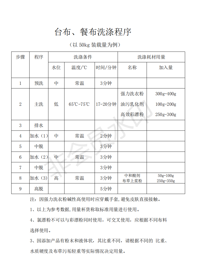 1.臺布洗滌時,通常高溫(70-75℃)和高堿(洗滌液pH值>12)條件下才能洗凈,高溫下有利于油脂熔化和纖維膨賬,對洗脫油脂的效果是無疑的。水洗廠一般是強力洗衣粉加入了大量燒堿做為洗滌。當強力洗衣粉中燒堿含量低時,則在主洗時增加強力洗衣粉加量或再燒堿時,鑒于燒堿度對纖維的損傷,不利于養(yǎng)護織物。為此,我們公司研發(fā)一種具有中等堿性的臺布洗滌粉,在加入同量強力洗衣粉條件下,同樣能洗凈臺布,則只需加入比正常量的乳化劑,這樣都可降低用戶的成本,又能達到滿意的效果。